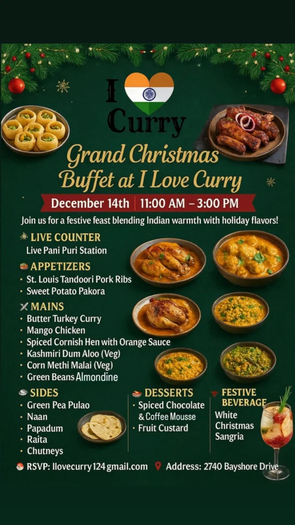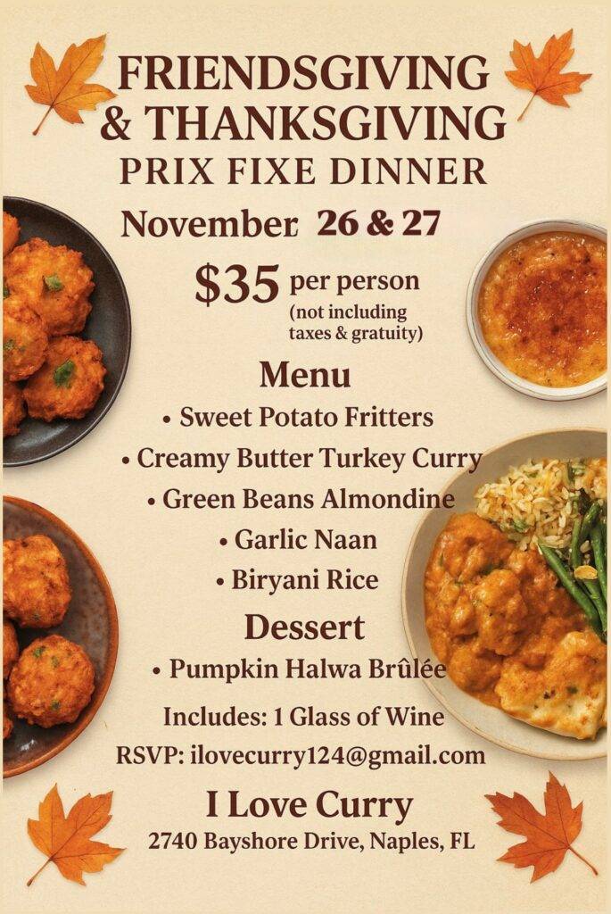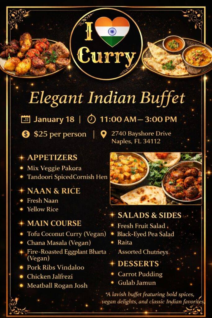 Follow us on Facebook and Instagram @ilovecurrynaples to keep up to date with our next special event or buffet. Keep an eye out for our next buffet! To rent our space or for catering email us at ilovecurry124@gmail.com.
